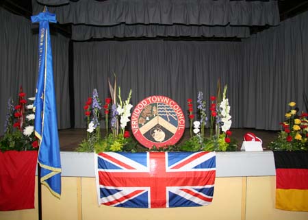 Speeches were given by the current Mayor of Verwood and Three Legged Cross, Kirsten Ekman,  Alain Levoyer, Gordon Himsworth, plus representatives from the Twinning Association, Champtoceaux and Liederbach am Taunus. Children from Emmanuel Middle School in Verwood and Queen Elizabeth's Upper School in Wimborne entertained us, and also led the guests in singing the European Anthem (Ode to Joy) and both verses of "The National Anthem". Soprano Emily Goad thrilled the guests with her rendition of 'Meadowlark'.The "Flag of Honour" was presented and the cake was cut.