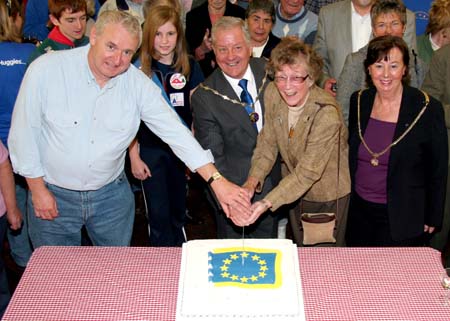 Having been chairman of the twinning association during the lengthy efforts to pro-mote harmony and understanding within Europe, Catharina Green was present at the cutting of a celebration cake in the Memorial Hall at 2:30 p.m. She was joined by current chairman Terry Bright and the Mayor and Mayoress of Verwood, Alec and Lesley Nicholls, plus twinning and town council members. Swedish MP  Kerstin Ekman  warmly congratulated everyone on the prestigious award and A Good time was had by all.